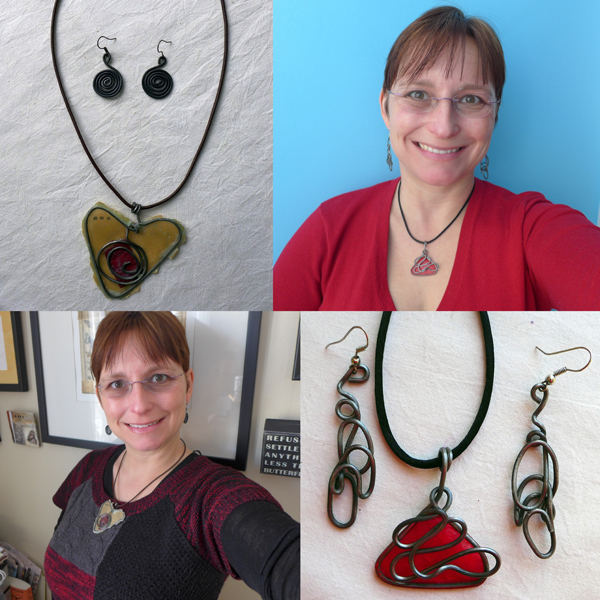 A pop of red is always fun. This musical heart is one of my first and favorite pieces, and I combined it with the coil earrings that are quite popular. My triangle pendants have found a few new homes, and any color is available. The smashed earrings have a life or their own.