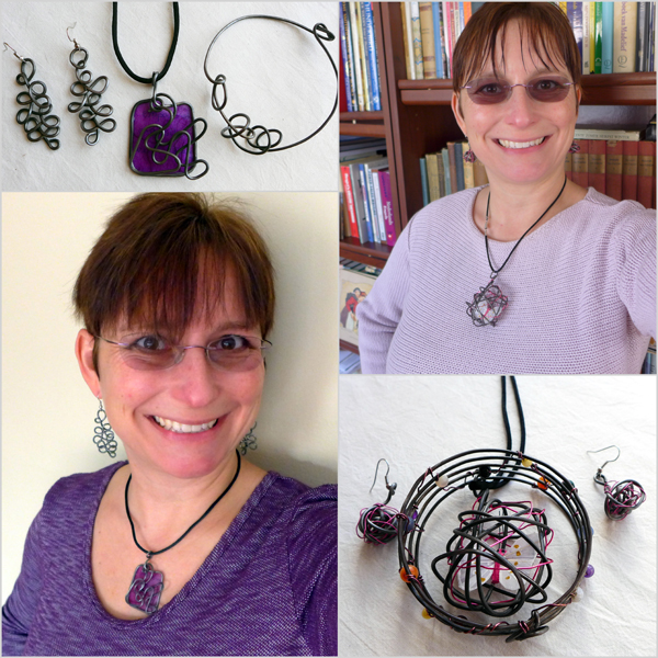 I wore the freshly listed double helix wax and wire pendant to the Textual Encounters opening, along with pink scribble ball earrings and a butterfly scarf pendant.