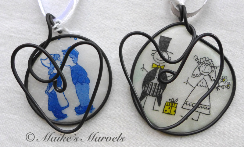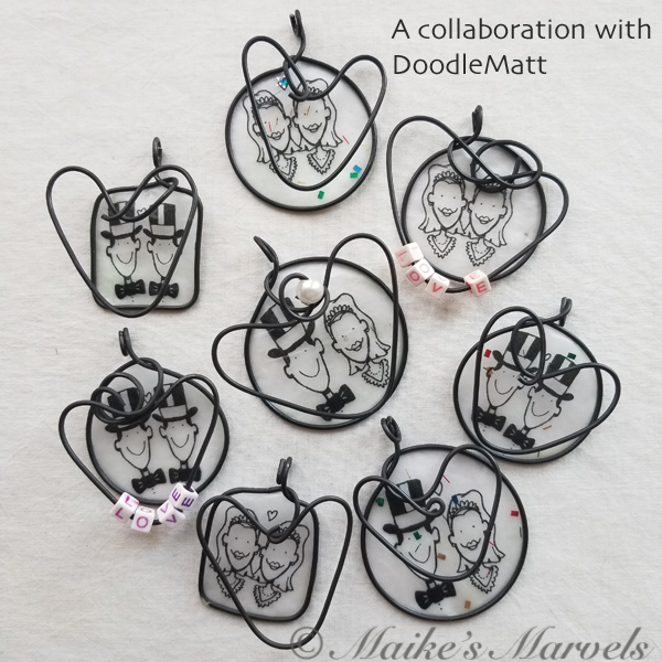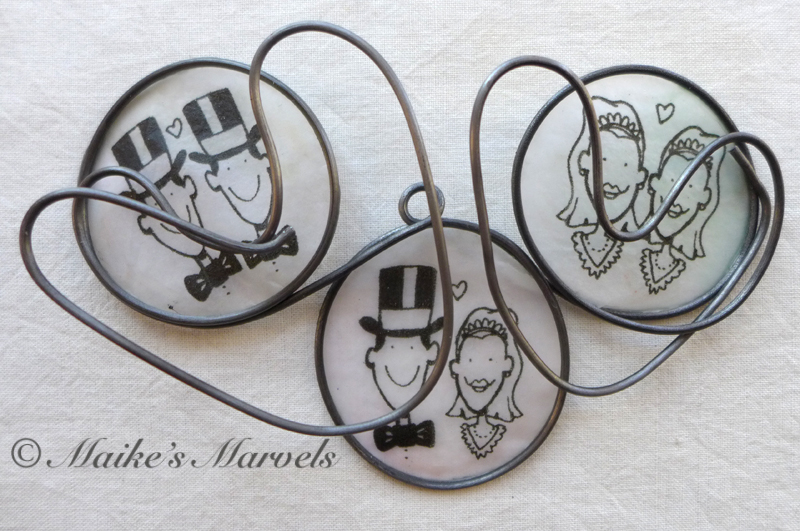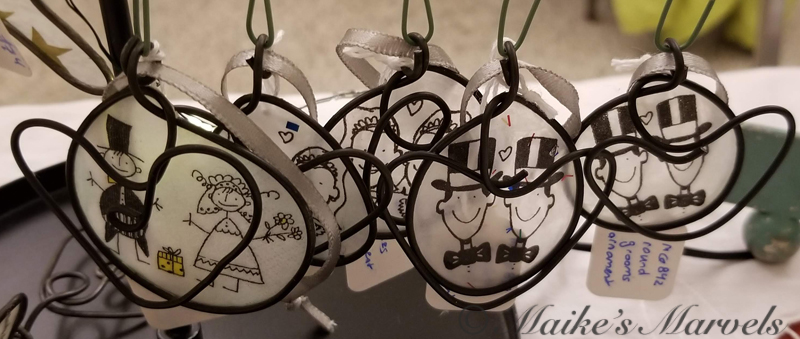 I have been making wedding ornaments ever since my cousin gifted me with a pack of her wedding napkins in 2009. I love the stick figure illustrations, and they resonate with customers too, both as wedding gifts and paper anniversary gifts.