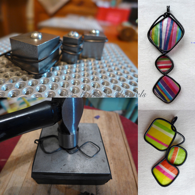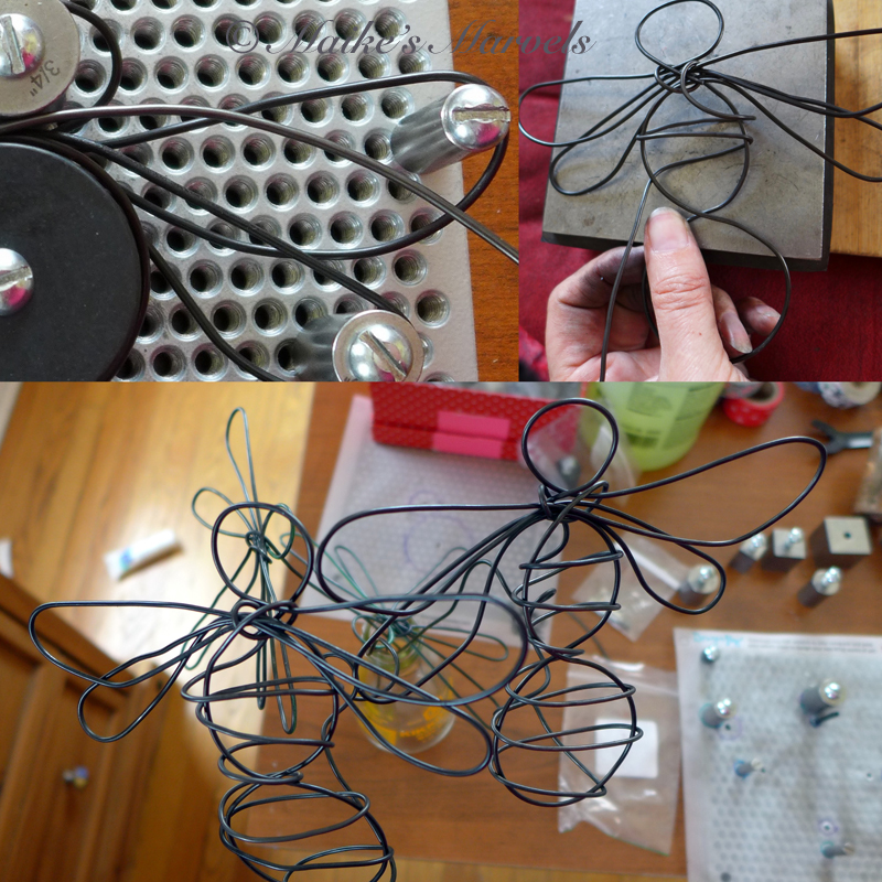 I set up my Now That’s a Jig! With various pegs, and my first try was a success. Soon I had created the general bee body. Next came the stripes, which are suggested by wrapping the wire around the bee.