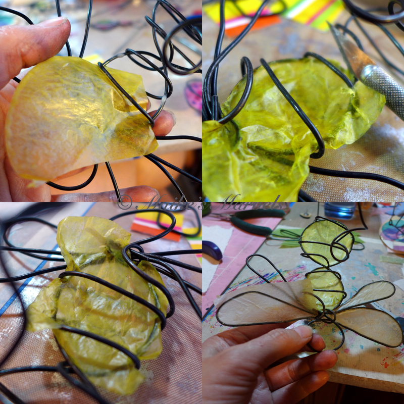 Squeezing in the paper to dress the body is a challenge, but well worth the effort. The allowance I have to leave in order to adhere the paper properly makes for some origami trials.
