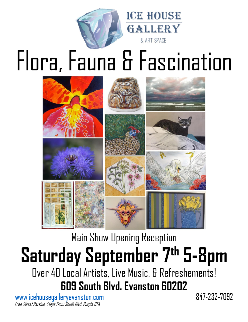 Hosted by Ice House Gallery Evanston, Flora, Fauna & Fascination explores the art of nature through a variety of media. They are featuring Flowers, Birds, and Animals alongside other nature-inspired works.