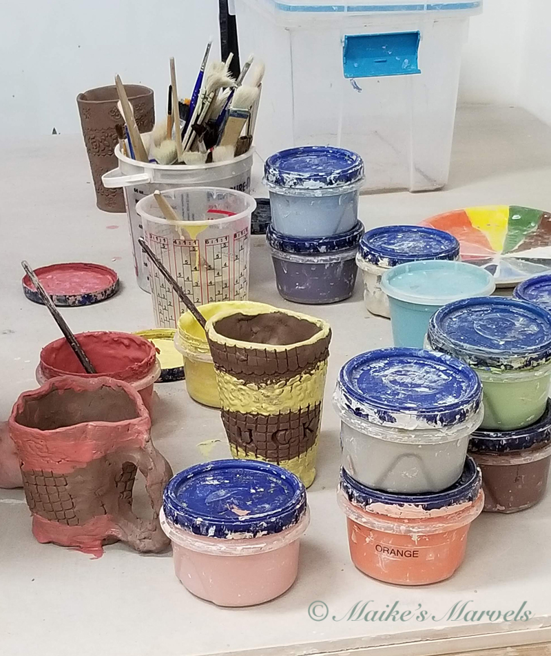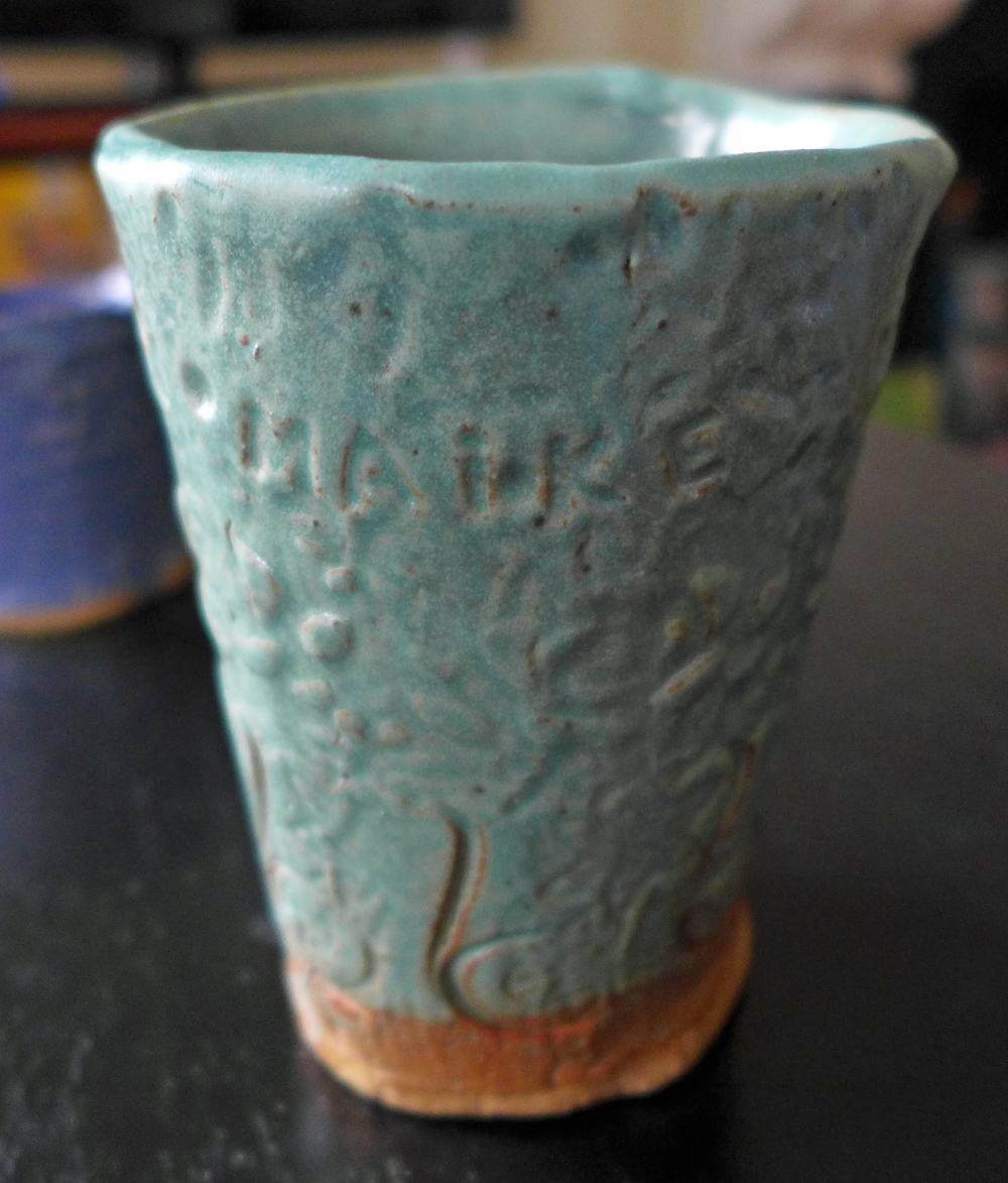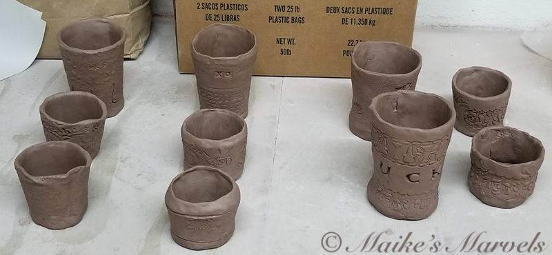 The mugs had to dry for a few weeks, and then Joanna glazed and fired our works.