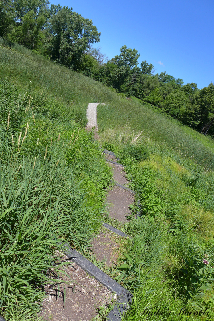 The elevated path leads to a wetlands trail, with a boardwalk cutting through reeds and a lovely pom-pom plant.