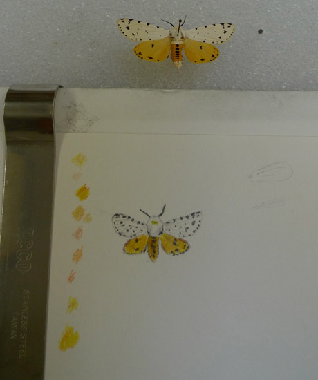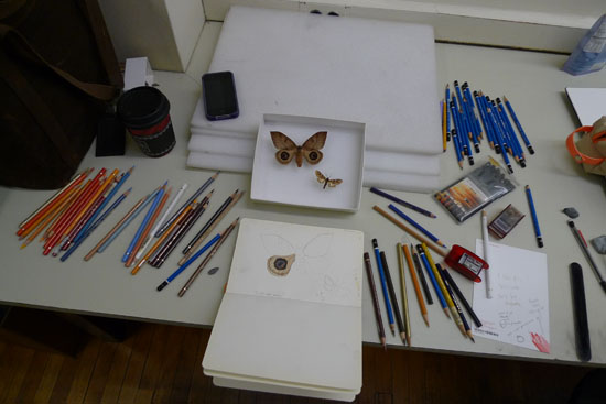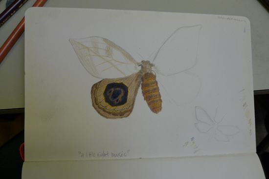 I started with a small moth, and learned more about proportion, and color-matching. In a multi-week session I would have started over, but for a first draft I am happy with this drawing.