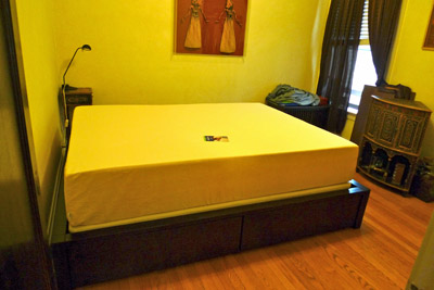 A few years passed, my life was too busy with deadlines, so I got new curtains and new sheets for the time being. I can’t even find a picture of my ‘original’ bedroom setup. It was that ‘temporary’ to me. My metal bedframe gave out in 2009, so I moved the headboard and footboard into storage, and made do with a box spring on the floor.