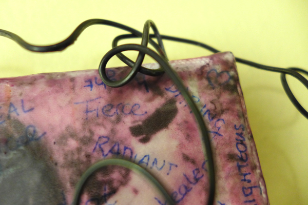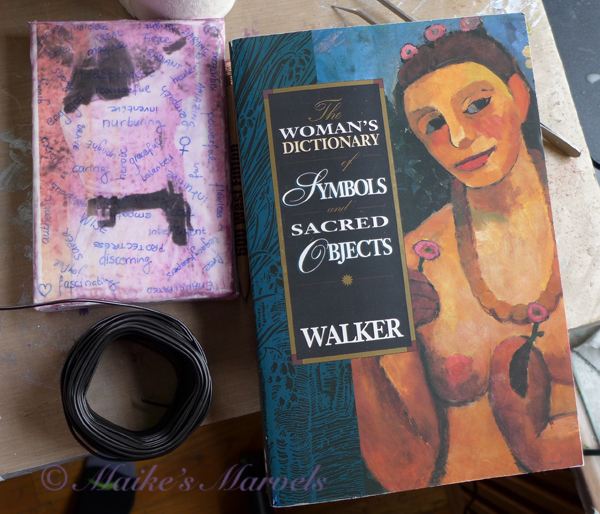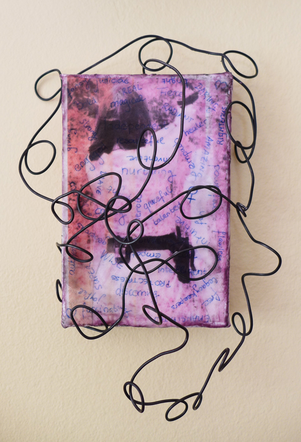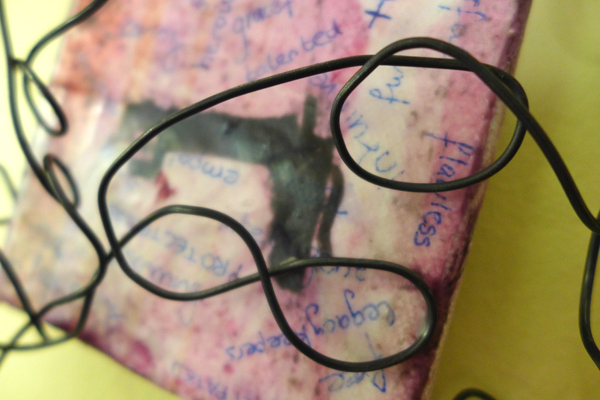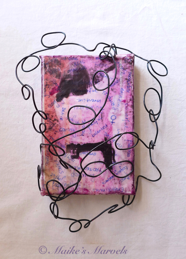 Then a few days before the final submission deadline I decided to fiddle with the wire and see what happened. I had dreamt up a vision of the canvas being framed by a wire flower, but that wasn’t nasty enough. Instead I went with swirls and the hint of an infinity symbol, to signify the curves, well-roundedness and lifecycle energy women are associated with.