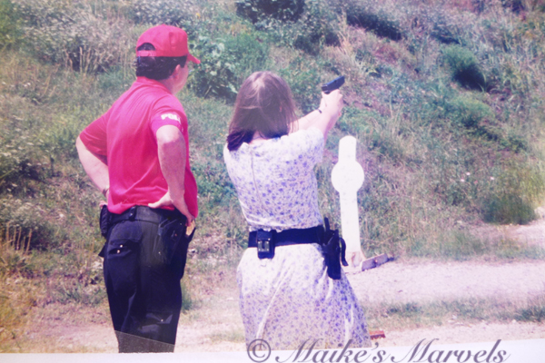 While pondering my submission in March, I came across an old photo that is perfect for the challenge. When I was a reporter at The Baytown Sun the Baytown police took us to a shooting range. While that event had been in my calendar, I forgot about it that day, and wore a girly flower dress. This made for quite the juxtaposition with the dark gun belt. I kept the target for a while, but cannot find it now.