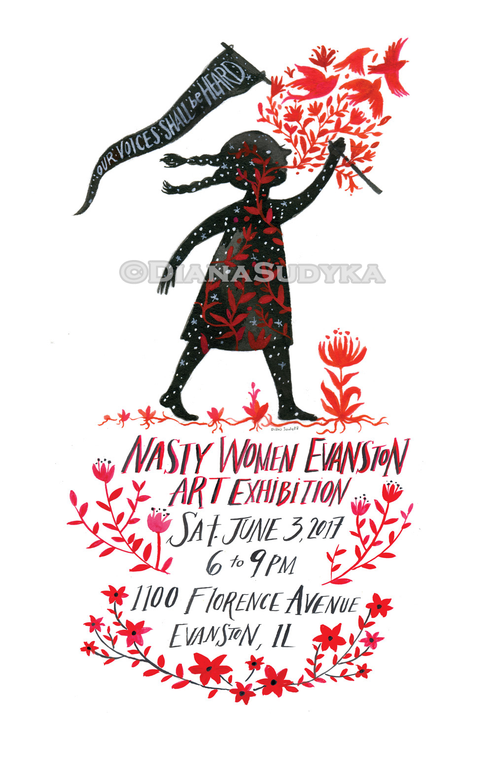 Some custom commemorative posters by Diana Sudyka are also available. A gallery of all the art work and the event will be available online at NastyWomenEvanston.