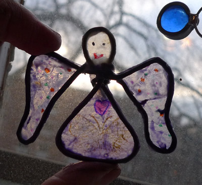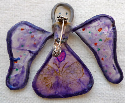 She is a pin, to serve as a guardian angel on a lapel or maybe a backpack.