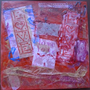 I submitted to this call for art without having seen the studio (technically a no-no, but hey, I’m a newbie at this). I poked around on the web site and saw a lot of very vibrant art, which prompted me to create Red Hot Love, a departure from my usual color scheme.
