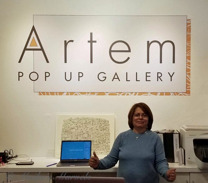 New owner Sarita Kamat came from the city of Belgaum in India 16 years ago and now lives in Skokie. Artem Popup Gallery is truly a family business now, with her husband Salil and daughter Riya being actively involved in the day-to-day operations, while son Varun also offers support. Sarita had a boutique in India, and currently works with watercolors and acrylics.