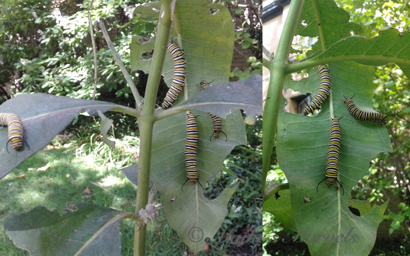 Meanwhile, I am thrilled to see Monarch Caterpillars in my neighborhood. There are numerous Milkweed stations, and I have spotted quite a few monarchs this summer, but no matter how hard I peered I couldn’t spot the caterpillars.