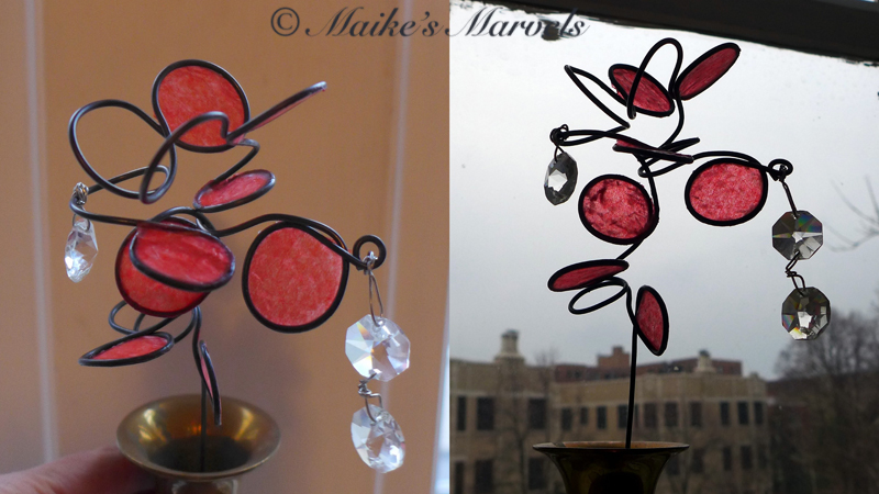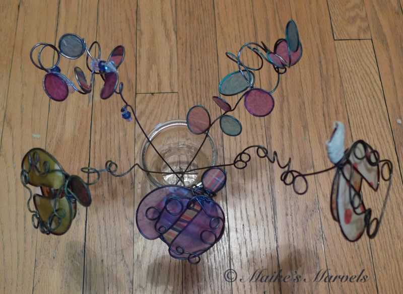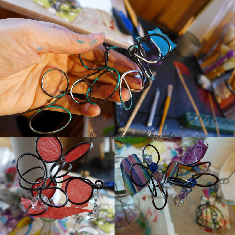 The pure alcohol inks may fade over time, I will need to look at my outside dragonfly to see how it looks after a long winter. As always, combining colors of tissue paper scraps is fun for these designs. Cutting them was a bit tricky with the way the infinities ones turned out, but no one got hurt!