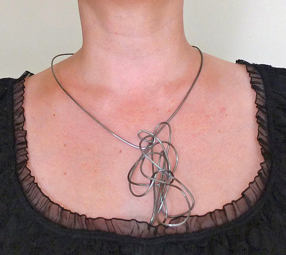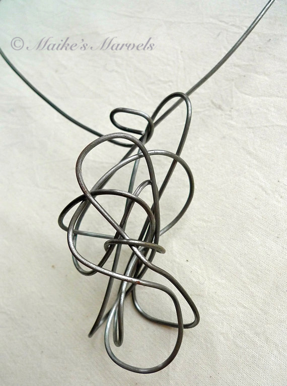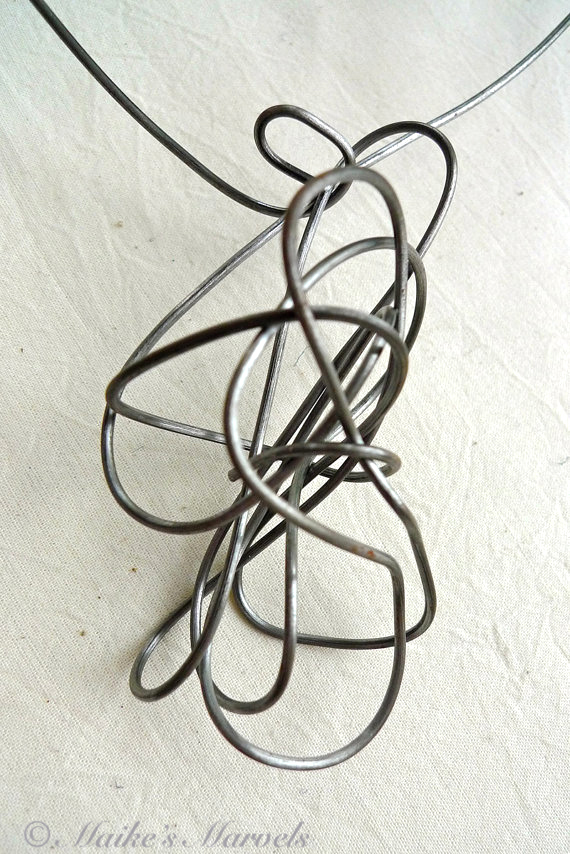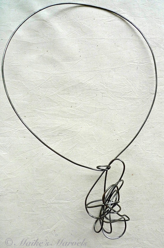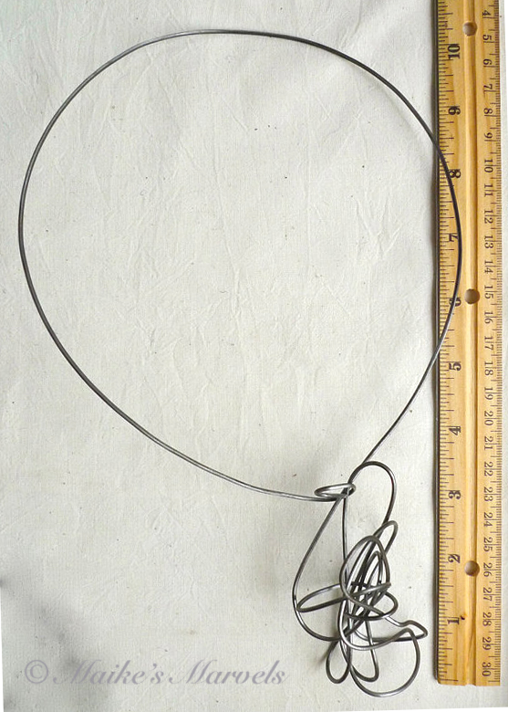 The necklace portion of this wire collar measures 21 inches, and the pendant is 3 3/4 inches long, and 2 inches at its widest point. The wire can be adjusted to suit your neck and shoulders.