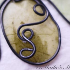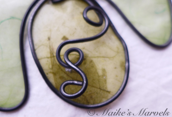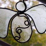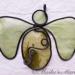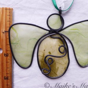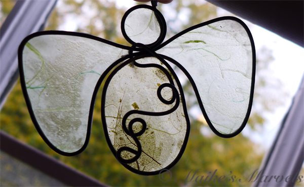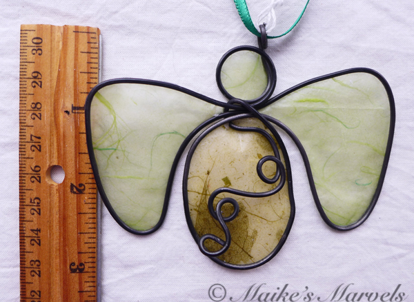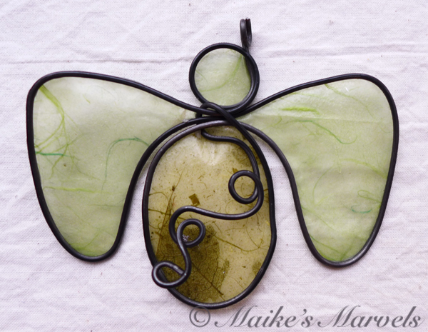This lovely angel honors the earth and the trees with its leaf design. I hand-bent steel wire into an angel shape on Now That’s A Jig! and gave this angel a swirly embellishment. Then I took handmade green paper, along with a piece that has a leaf embedded, and dipped it into encaustic medium. The end-result makes for a lovely green translucent angel reminiscent of wood fairies.