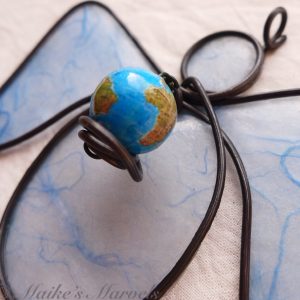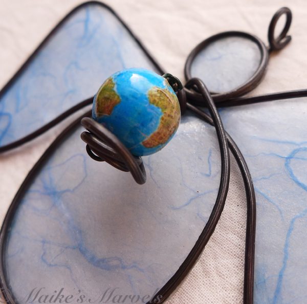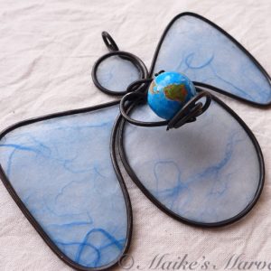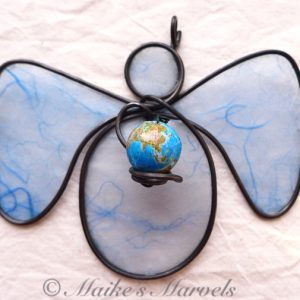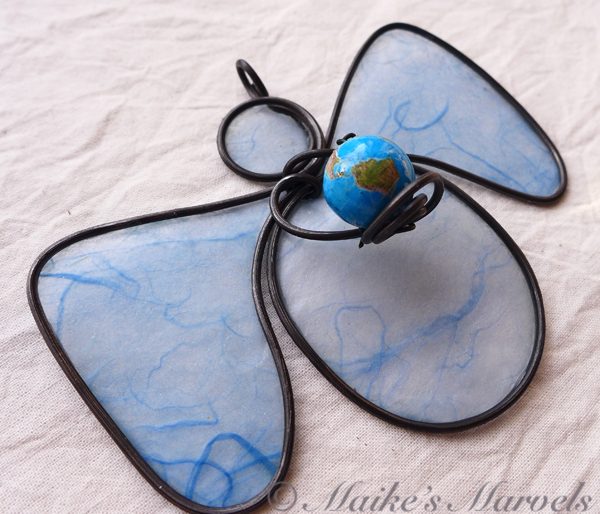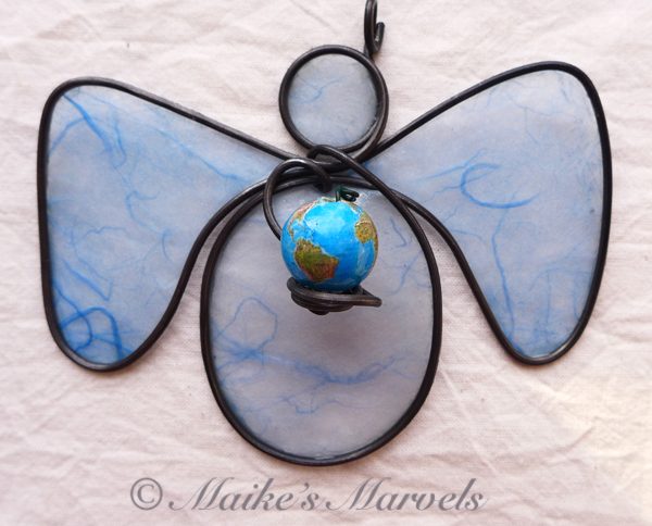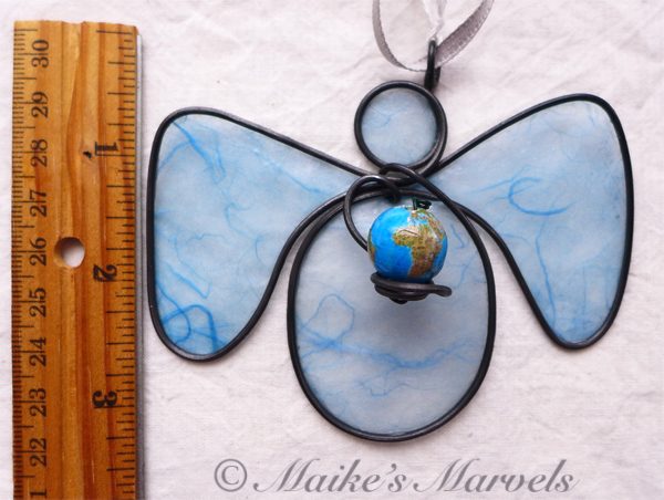 Steel wire has been hand-bent into an angel with a spiral wrapped around the globe bead. The 14 mm bead is made from a resin or paper mache and twists to show tiny continents. I took baby blue handmade paper and dipped it in encaustic, a beeswax and resin mixture. The warm paper was then adhered to the wire with an iron to create a lovely translucent angel perfect for hanging around the house. It comes with a silver satin ribbon for hanging. This angel measures 3 1/3 inches tall by 3 3/4 inches wide and 7/8 inch deep.