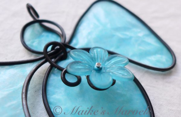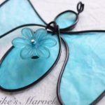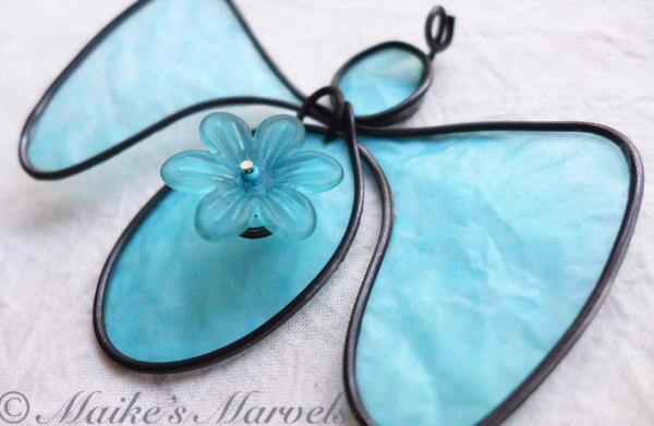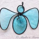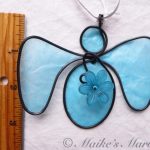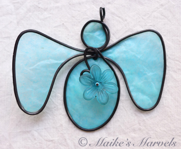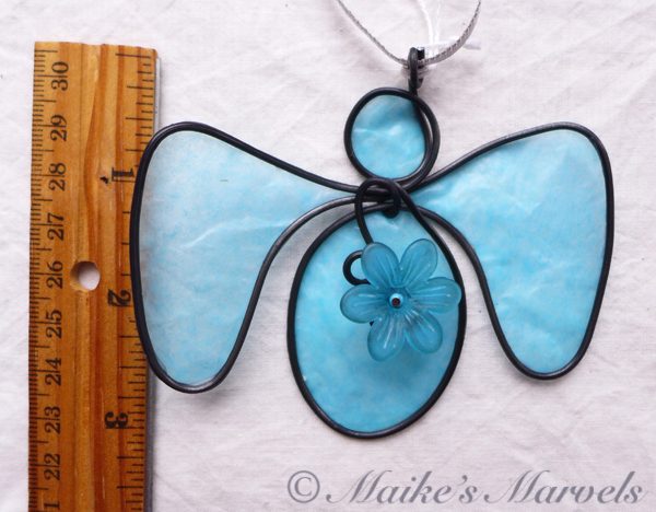 I found these resin flowers at a bead show and couldn’t resist putting one on an angel. I wrapped 16-gauge steel wire into the angel shape along with a swirl to attach the lightblue flower to.  Then I dipped the blue tissue paper in a beeswax and resin mixture and adhered it to the steel wire. This angel comes with a white satin ribbon for hanging. It measures 3 1/4 inches tall by 3 3/4 inches wide and 1/2 inch deep.
