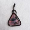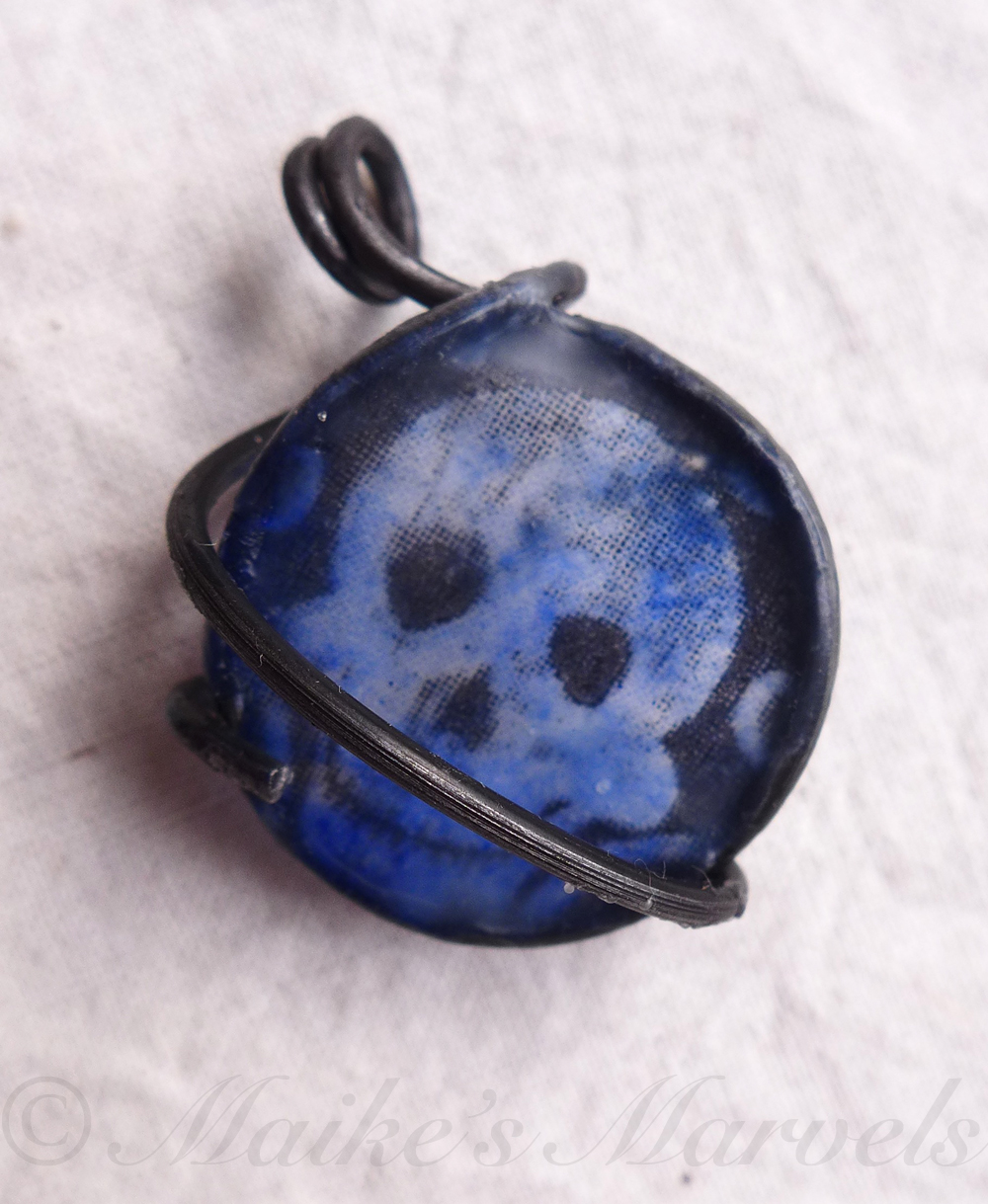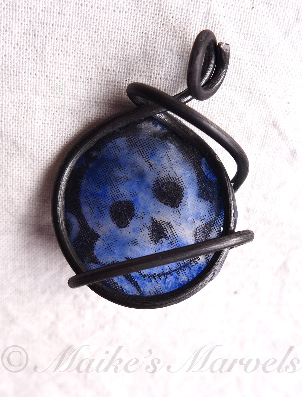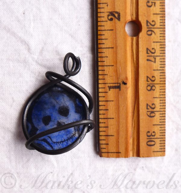 A Skull design napkin was dipped in encaustic medium along with blue encaustic paint to give it a cobalt hue. The steel wire is wrapped in a round shape with a dimensional swirl for added interest. This small pendant measures 1 3/8 inch tall by 1 inch wide and comes with a =black satin necklace cord.