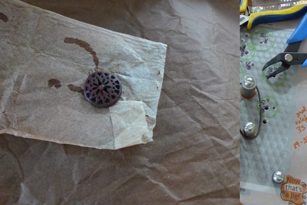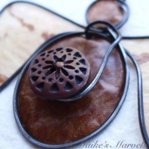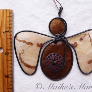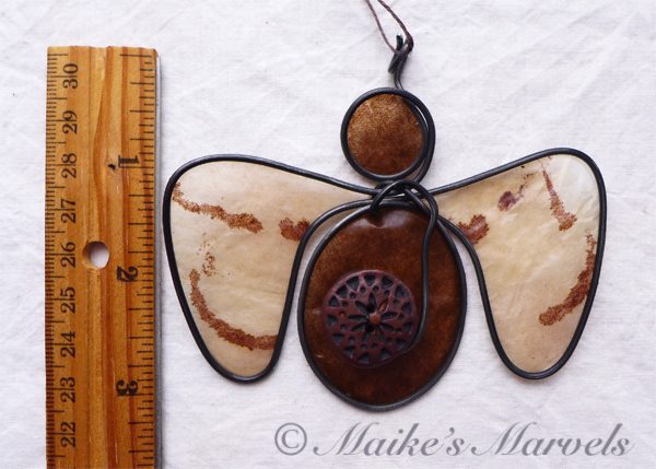 I wrapped 16-gauge steel wire into the angel shape along with a swirl to attach the button to.  Then I dipped brown tissue paper and inked teabags in a beeswax and resin mixture and adhered it to the steel wire. This angel comes with a brown raffia string for hanging. It measures 3 3/8 inches tall by 3 3/4 inches wide and 1/2 inch deep.