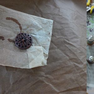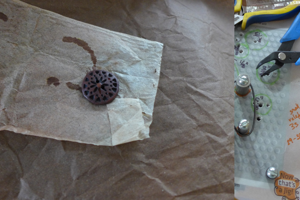 I love Vintage buttons and have a hard time resisting them when I poke around antique shops, or Vogue Fabrics’ button bin. Lately I am on a mission to use up what I own before buying new, so I incorporated this lovely brown daisy button into an angel. The button has small flower petal impressions, along with tiny dots and triangles. The triangles look a bit like hearts to me.