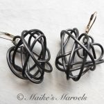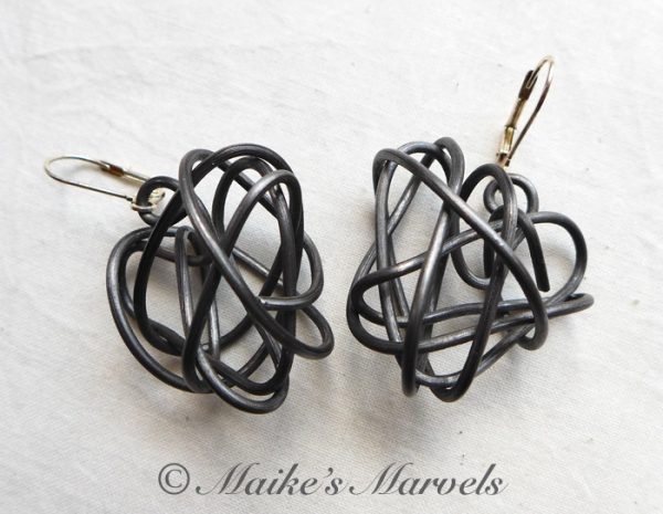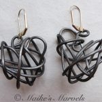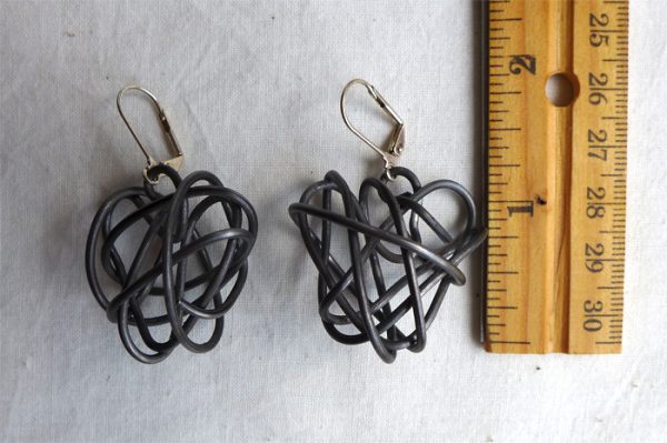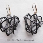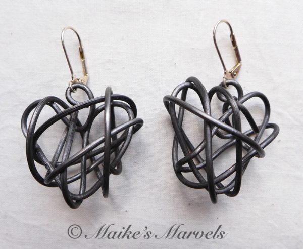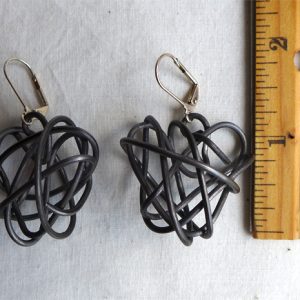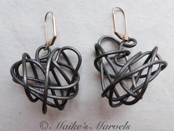 Show your love for life with this unique pair of steel wire earrings. 16-gauge steel wire was hand-bent into individual heart shapes to make this sculptural earring pair. The hearts measure 1 1/4 inches long by 1 3/8 inches wide and come with a lever-back earring hook.