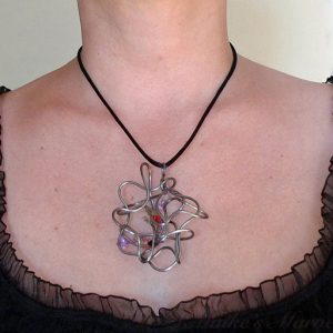The lightweight pendant measures 2 3/4 inches long, 2 1/4 inches wide and 1 inch deep. The pendant comes with a black satin cord (16″ shown).