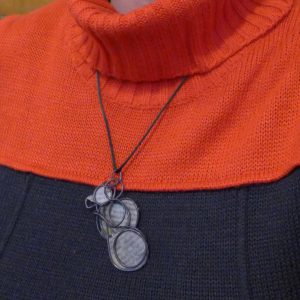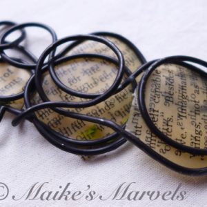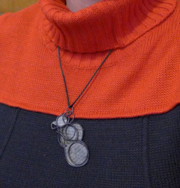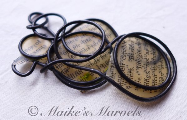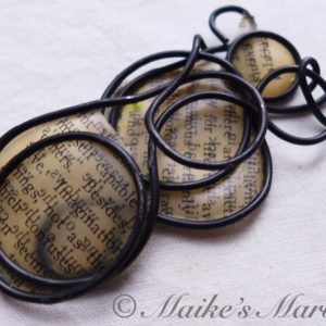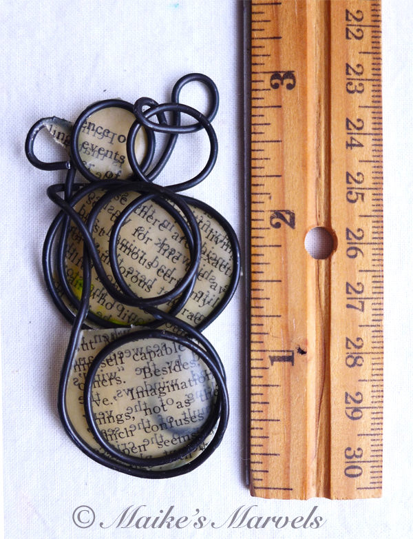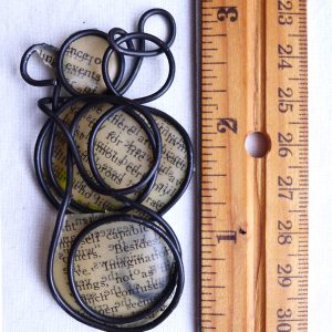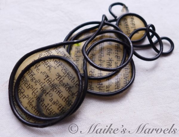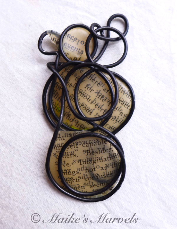 Do you love Charles Dickens? This pendant has a page that discusses David Copperfield and Dickens’ writing skills. I wrangled steel wire into an infinity shape while chatting with a friend, and then cut out a page from the David Copperfield introduction to adhere to the steel form. The paper was dipped in encaustic medium and then adhered to the steel wire with a quilting iron.