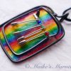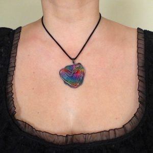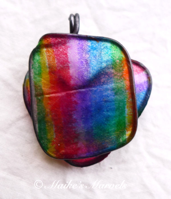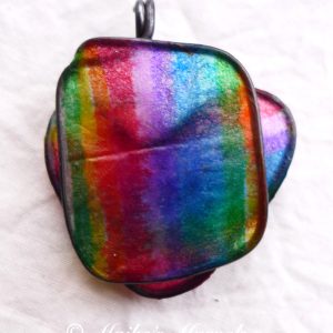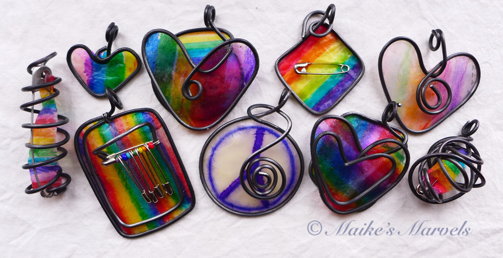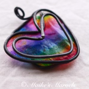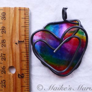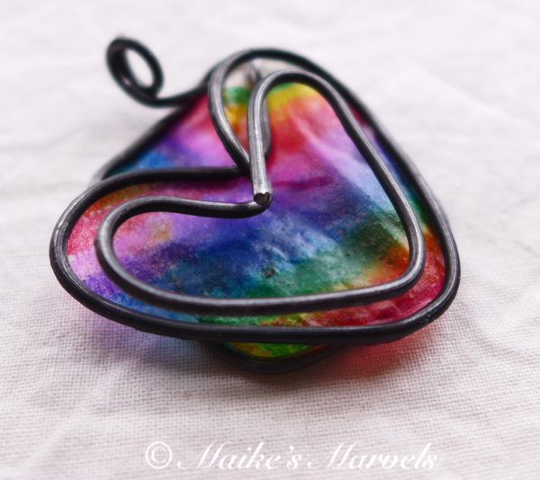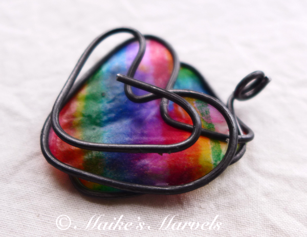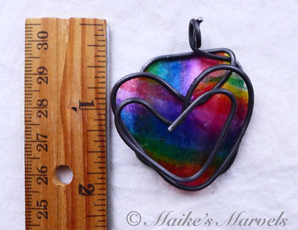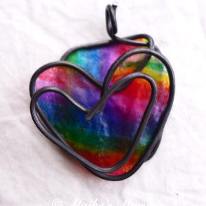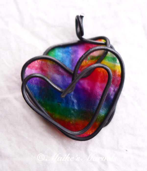 Steel wire was hand-bent into a rectangular shape and layered with a heart and a smaller heart on top. I hand-colored tissue paper with rainbow colors which was then dipped into encaustic medium (a resin and beeswax mixture). The paper was then adhered to the wire and cut into the lovely colorful shape.