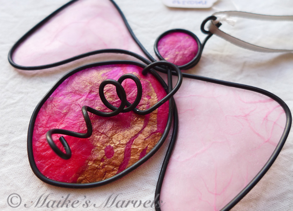 Isn’t this a brilliant beauty? This lovely angel adds a pop of color and sparkle to your life with her vibrant presence. Steel wire was hand-bent into the angel shape. Handmade fuchsia and gold-leaf paper was dipped into encaustic medium and then attached to the wire with the resin and beeswax mixture. The angel comes with a silver satin ribbon for hanging. This angel measures 3 3/8 inches tall by 4 inches wide.