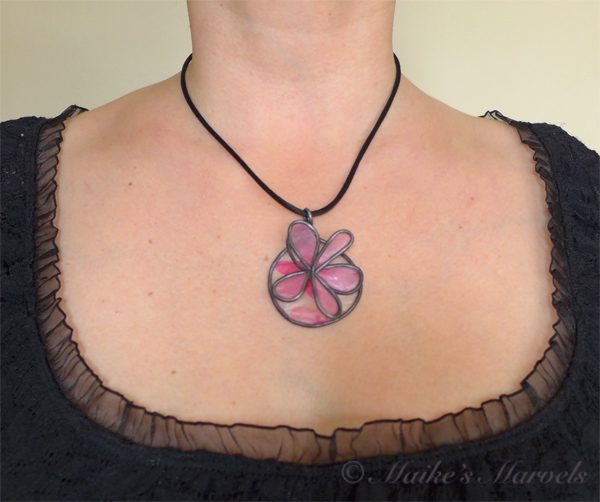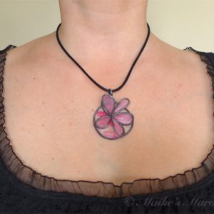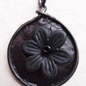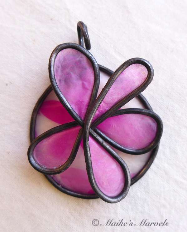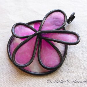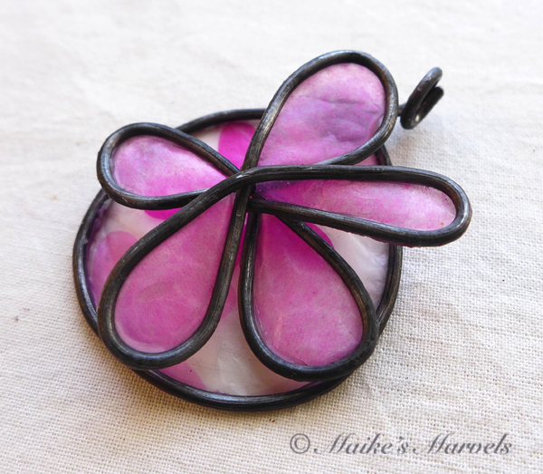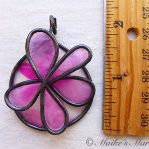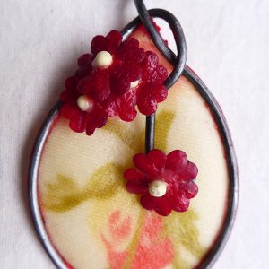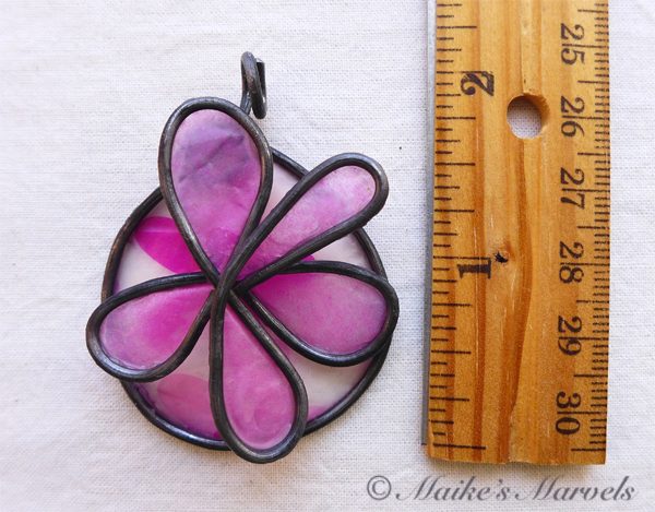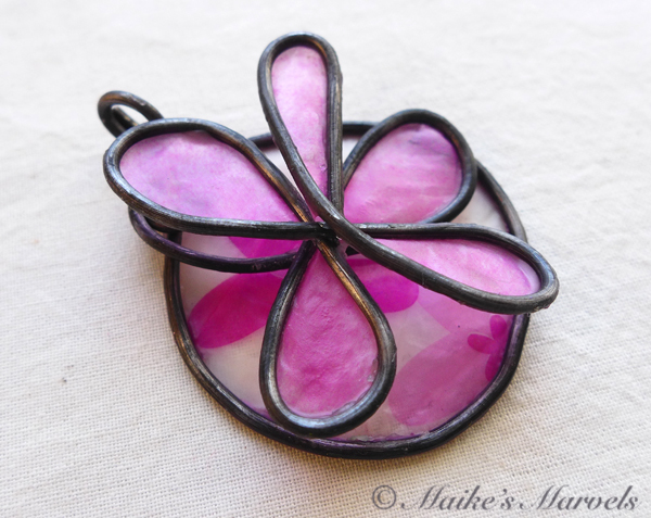 A lovely gift wrap served as the inspiration for this 5-petaled fuchsia flower. Industrial wire was hand-bent into a flower shape with a round background. Each petal was hand-embellished with pink waxed tissue paper. Then the inspirational floral gift wrap was dipped in beeswax and adhered to the round back of the pendant.