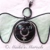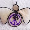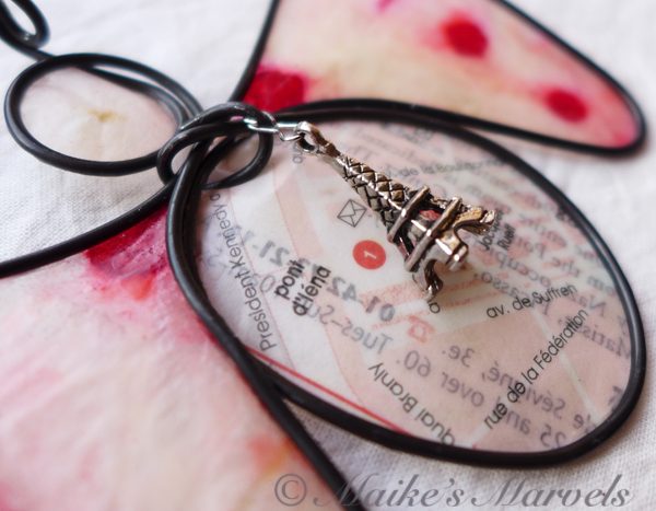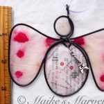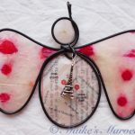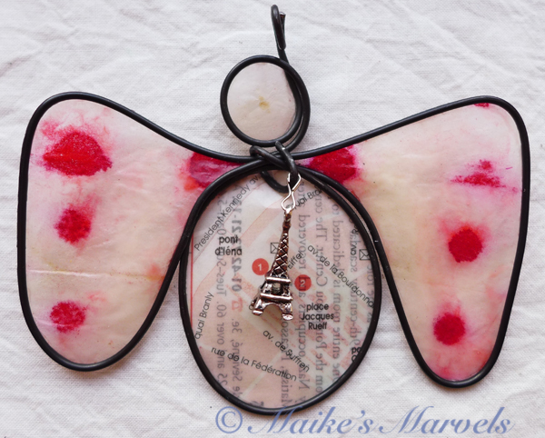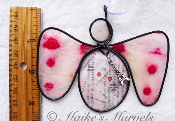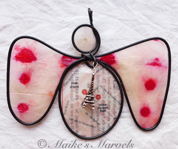 Steel wire was hand-bent into the angel shape. Then a pewter Eiffel Tower charm was attached. A portion of a Paris map from a travel guide was cut out and dipped in encaustic medium. Then the map and hand-inked tissue paper attached to the wire with the resin and beeswax mixture. The angel comes with a white satin ribbon for hanging. This angel measures 3 1/2 inches tall by 4 inches wide.