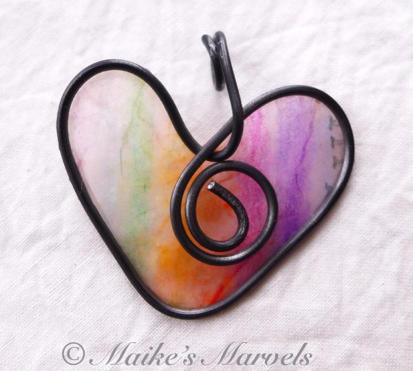 I hand-colored pink artisan paper with rainbow pastels. Then I wrapped steel wire into a heart shape. The paper was dipped into encaustic medium (a resin and beeswax mixture) and then adhered to the wire.