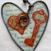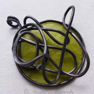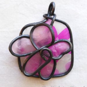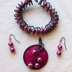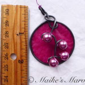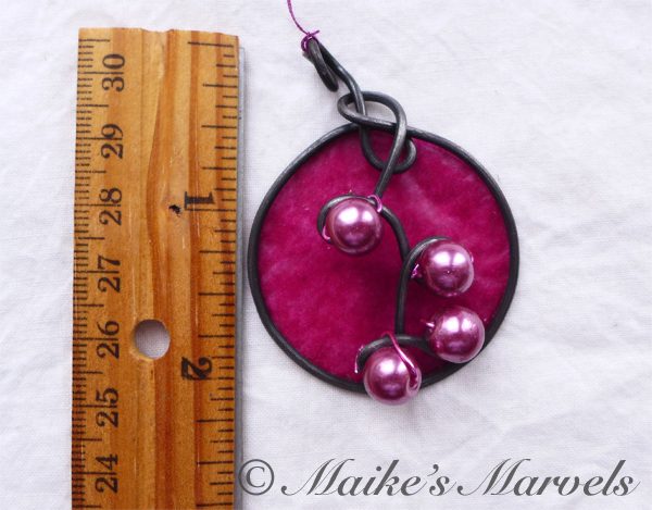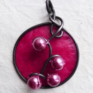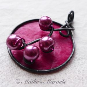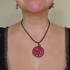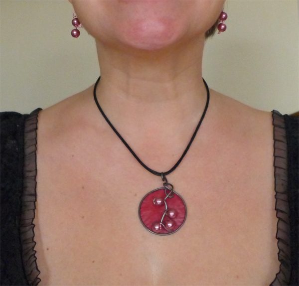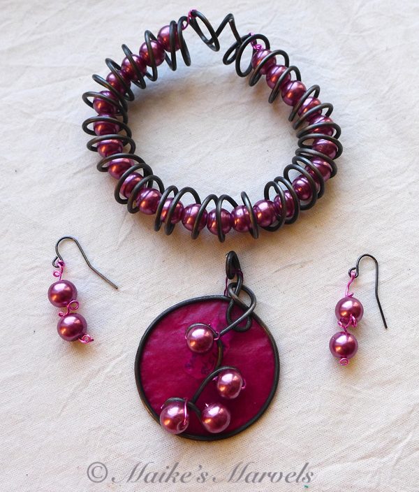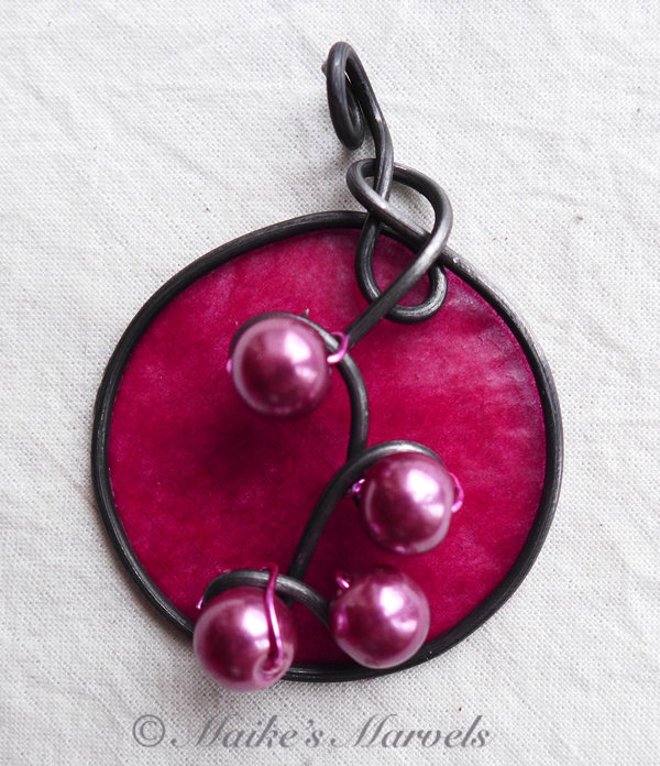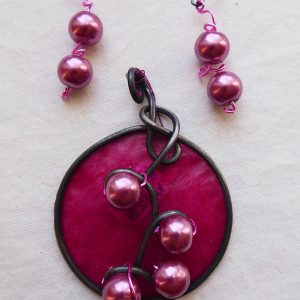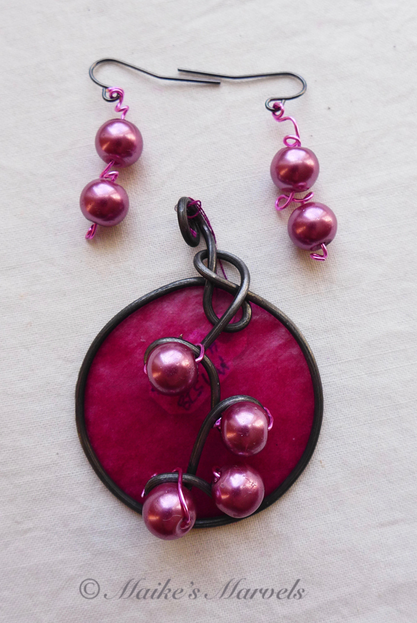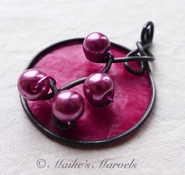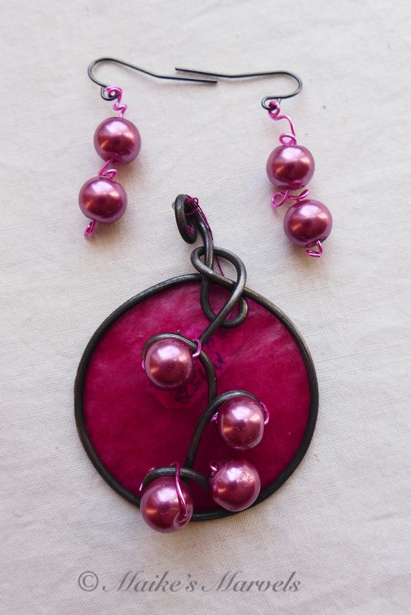 I wrapped 16-gauge steel wire into a round shape with swirls to insert the pearls into. Then I added burgundy tissue paper dipped in encaustic medium to give the pendant some pop. This dimensional pendant measures 2 1/4 inches long by 1 3/4 wide. I strung the pink pearls onto coated copper wire for a whimsical pair of matching earrings.