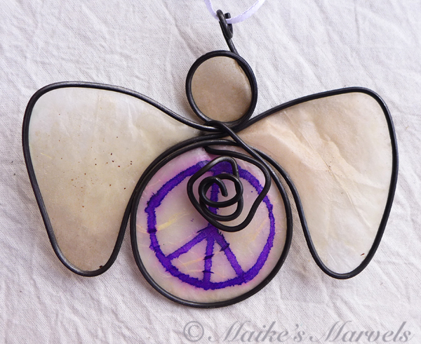 Steel wire has been hand-bent into the angel and spiral shape. Then artisan paper was embellished with a peace sign and attached to the wire with encaustic medium. It comes with a white satin ribbon for hanging. This angel measures 3 1/4 inches tall by 3 3/4 inches wide.