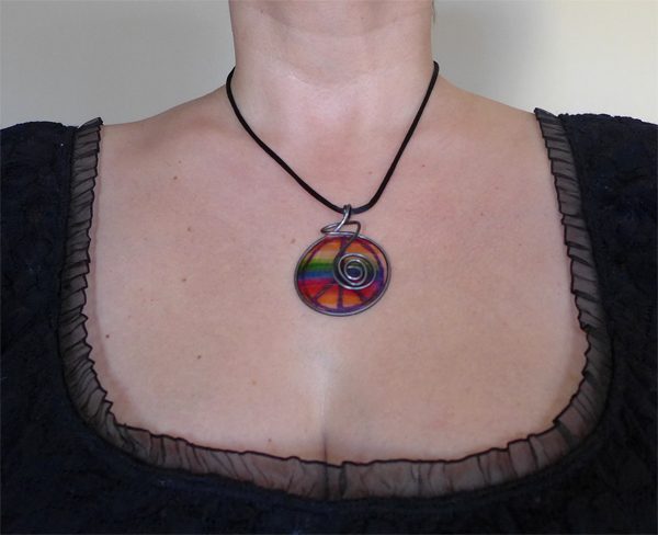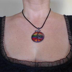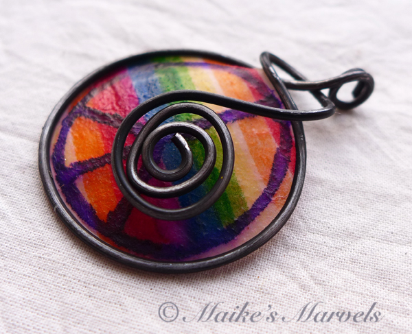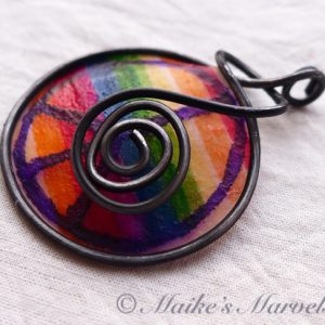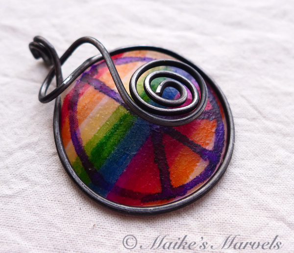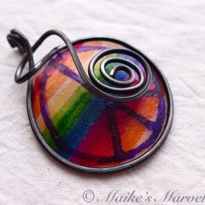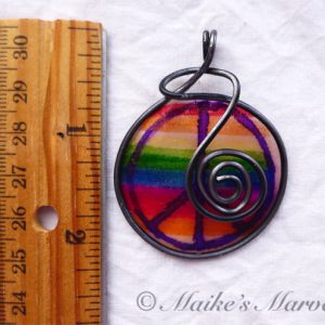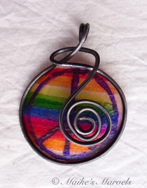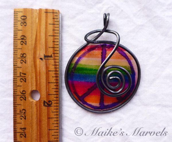 I hand-drew the rainbow and purple peace symbol on artisan paper, and then dipped it in encaustic medium. This beeswax and resin mixture was then used to fuse the paper to the steel wire circle shape. May peace unfurl!