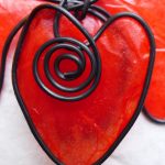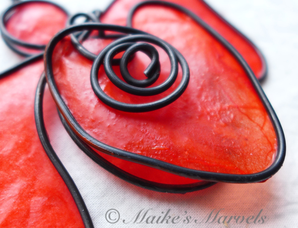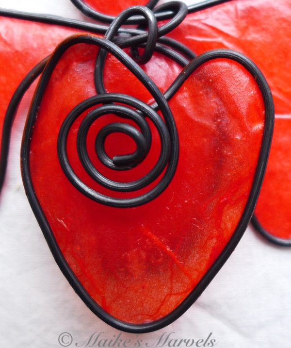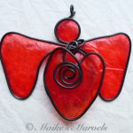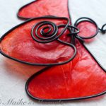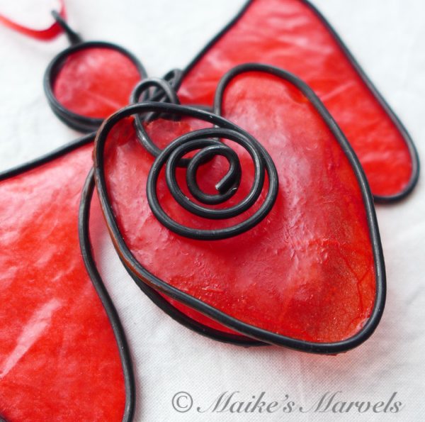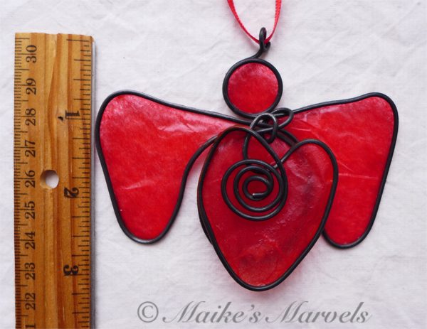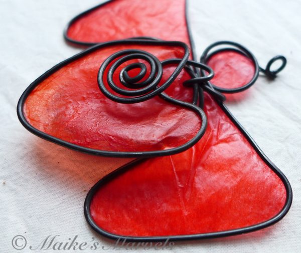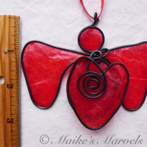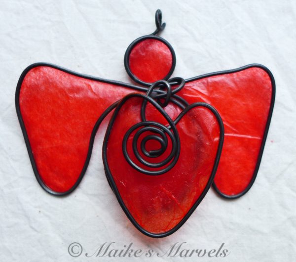 Show your love with this big-hearted angel. This red angel was created by hand by bending steel wire into the angel shape, followed by the heart and coil embellishment. The 3 layers of steel were then dressed with red tissue paper dipped in encaustic medium, and adhered to the wire with encaustic medium as well.
