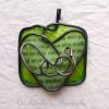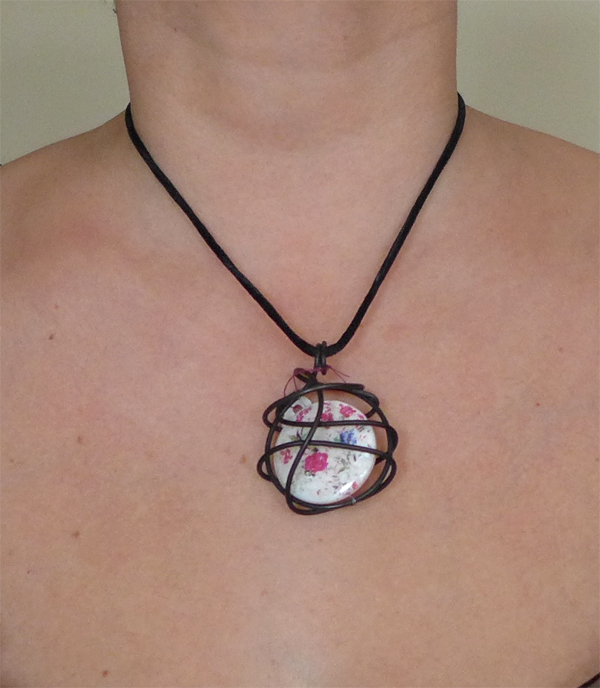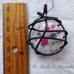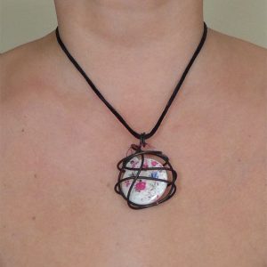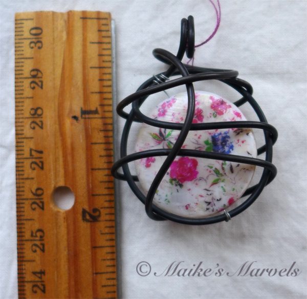 This lovely pendant measures 2 inches long by 1 1/2 inches wide and is 7/8 inch deep. It comes with a black satin cord. Pictured is a 16″ cord.