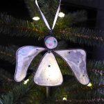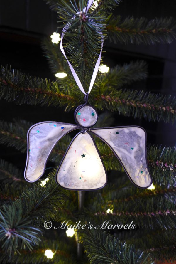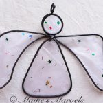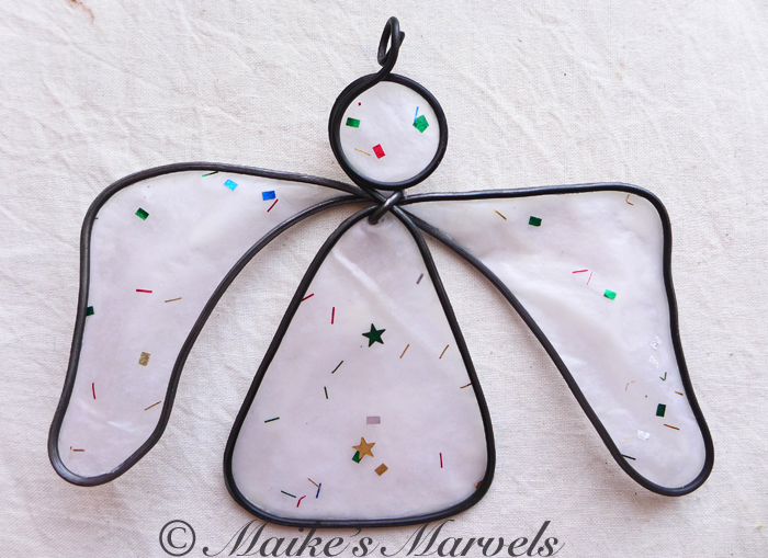 This lovely angel offers sparkle and sass to the person who adopts it. Made from tissue paper enhanced by sparkly confetti, the wax and wire angel can be hung as an ornament on a door, in a window, or as a holiday decoration. This hand made steel wire angel measures 4 inches tall by 4 1/2 inches wide. Steel wire has been hand-bent into the angel shape, after which the confetti tissue paper was attached to the back with encaustic medium. It comes with a white satin ribbon for hanging.