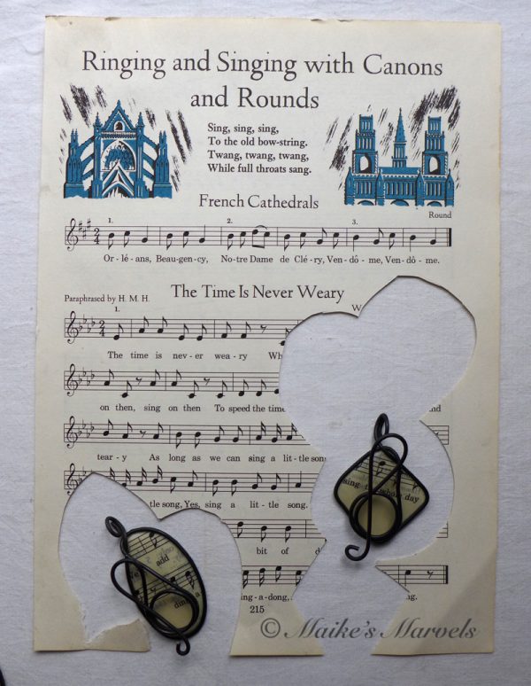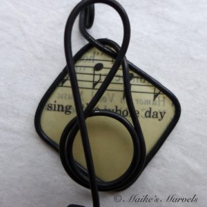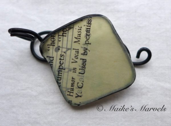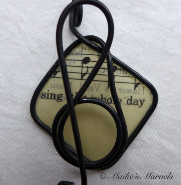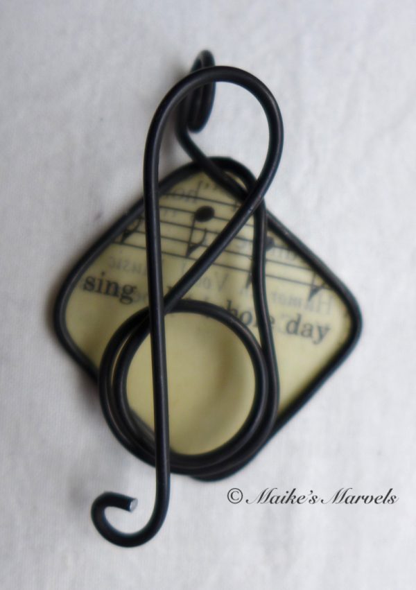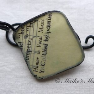 This square pendant was created by hand-bending wire around a square peg and then forming a violin clef on top. Then I looked through my songbook and found the phrase “Sing the Whole Day” fit perfectly inside this shape. So I cut out that portion of the “We are Never Weary” song, which is attributed to Mozart. The paper was dipped in encaustic medium so it would be more archival, and then adhered to the wire shape with the molten wax.