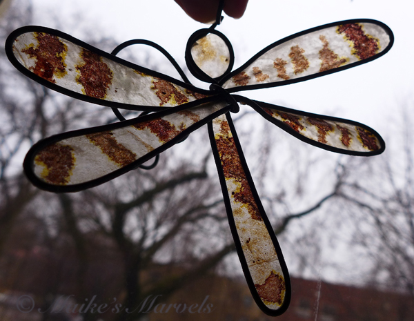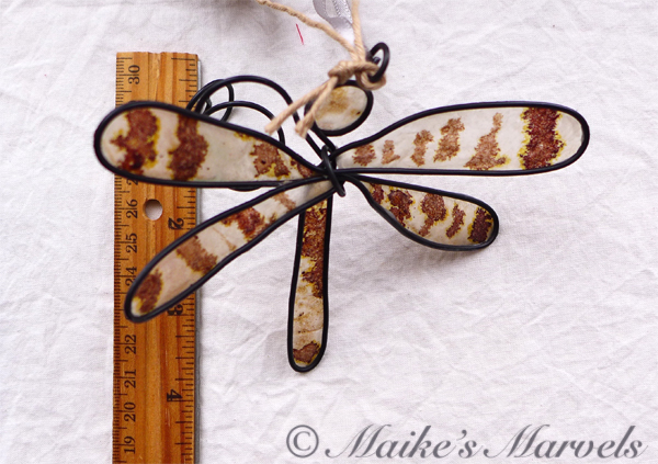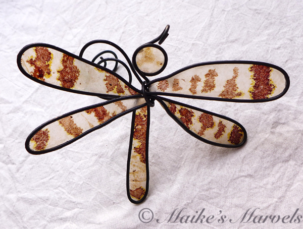 I jigged a dragonfly from 26-gauge steel wire. Then I dipped the hand-inked teabag into encaustic medium (a beeswax and resin mixture) and adhered it to the shape. This dragonfly has a wingspan of 4 3/4 inches and measures 4 inches long. A 2 inch spiral allows it to float in the air, and additional critters can be attached through a loop on its head.