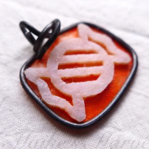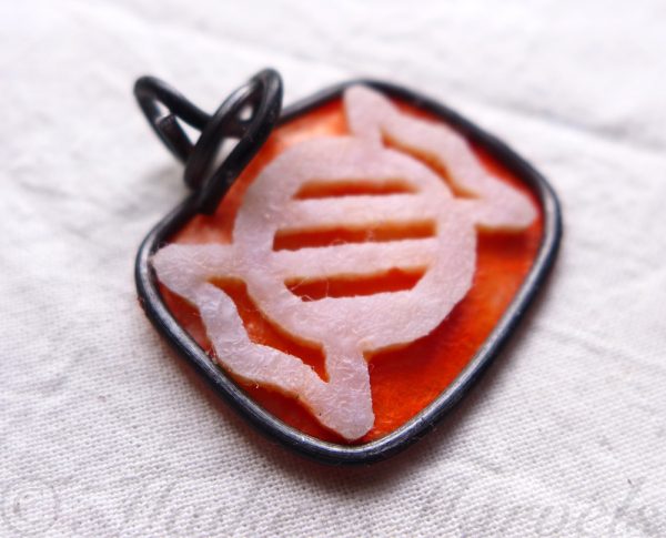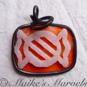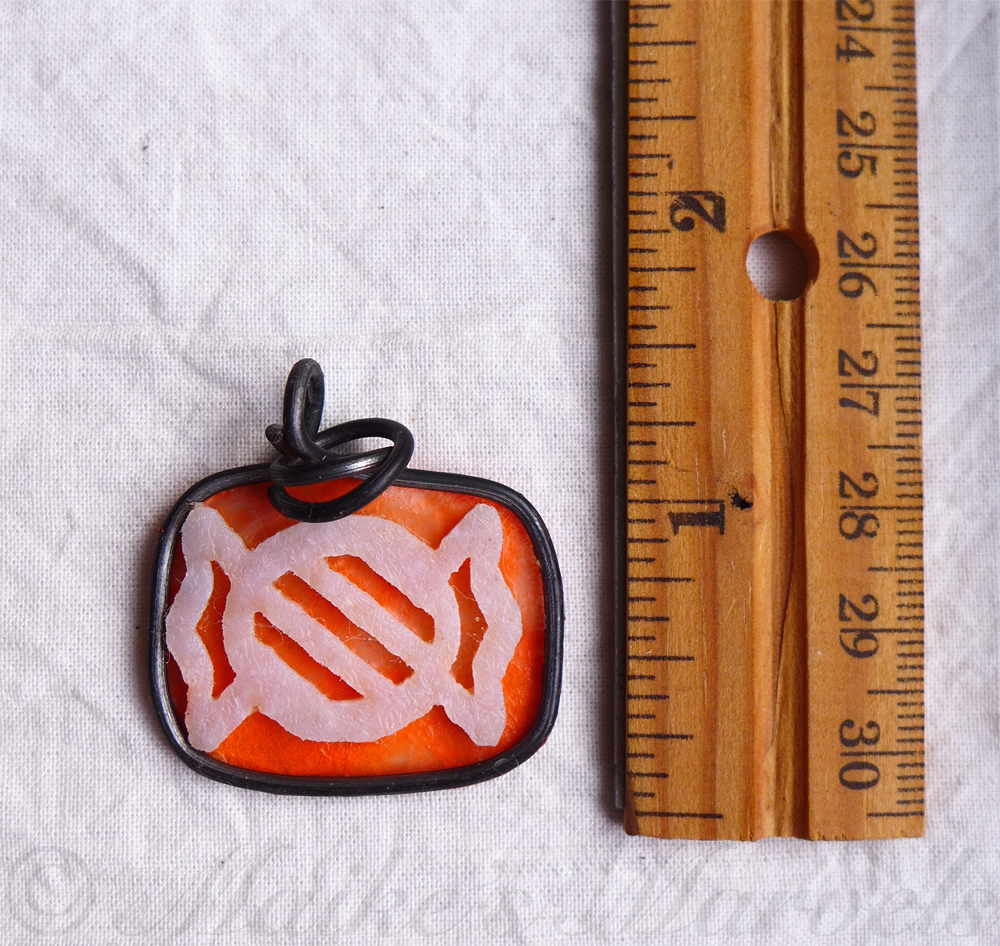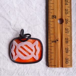 A piece of white felt cut in the shape of a wrapped candy was embedded in encaustic medium and attached to orange handmade paper, also dipped in wax. The collage was adhered to a steel wire rectangle that measures 1 1/4 inches wide by 1 7/8 inches high. The pendant comes with a black satin cord. Check out the rest of the Halloween Collection.