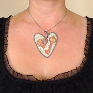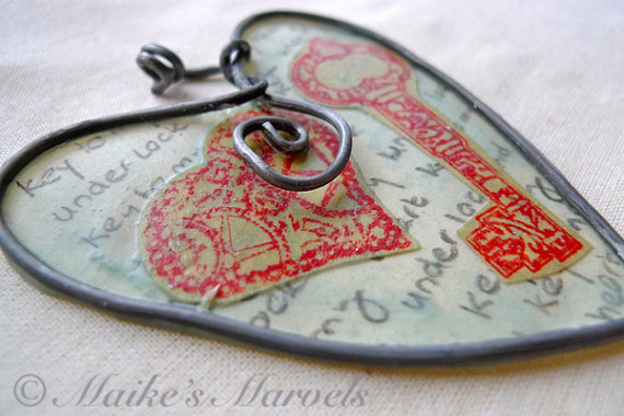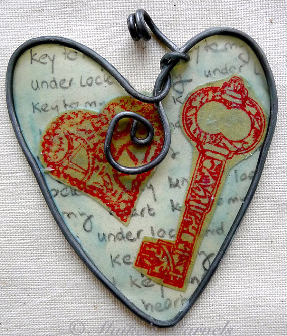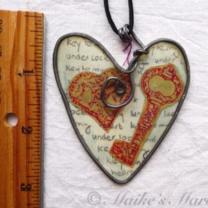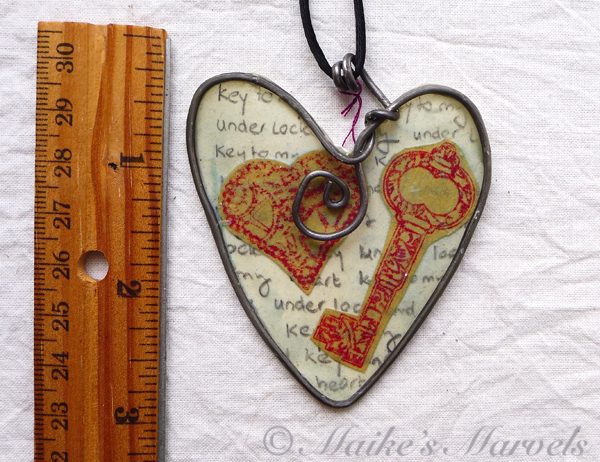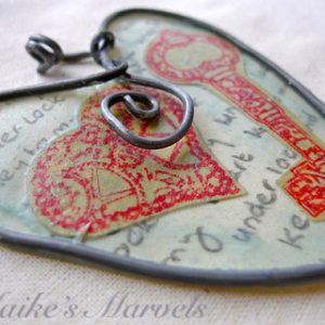 This lightweight pendant was created with love and includes handwritten statements “Key to my heart” and “under lock and key”, a hand-stamped steampunk heart and steampunk key in red ink complete the adornment. I hand-wrote the phrases in pencil. Then I stamped the key and the heart onto separate paper and cut out the shapes. I dipped all of it in encaustic medium (a wax and resin blend), and then collaged the heart together. The paper was then adhered to the steel wire shape.