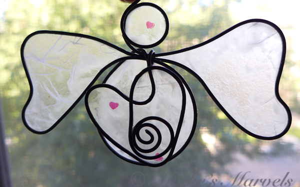 Will this angel be your Valentine? I had some tissue paper with the sweet read hearts in my stash so I wire-wrapped an angel with a spiraled heart. Then I dipped the tissue paper in a beeswax and resin mixture and adhered it to the steel wire. This angel comes with a red satin ribbon for hanging. It measures 3 1/2 inches tall by 4 3/4 inches wide and  1/2 inch deep.