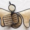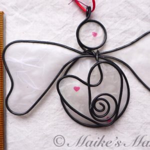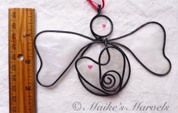 Steel wire was hand-bent into the angel shape, along with 2 rings in the form of an infinity shape. Then a metal and crystal flower shape was attached to the rings. White tissue paper was dipped in encaustic medium and then attached to the wire with the resin and beeswax mixture. The angel comes with a silver satin ribbon for hanging. This angel measures 3 inches tall by 4 inches wide and 1/2 inch deep.