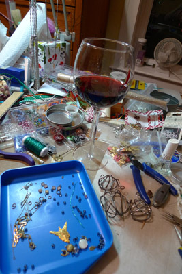 I don’t have typical days. Some days I get up at 8 a.m. and will plan and run errands and administrate and blog until 11 p.m. On other days I don’t really start ‘working’ ’til noon, after a leisurely breakfast and poking around Facebook and finally getting out of my jammies. Then there is a burst of activity from noon til 6 p.m.—wrangling wire, coming up with ideas, researching more fairs and submitting to deadlines, after which I crash and veg in front of Netflix for a while. Sometimes the intensity of the work makes up for the quantity of hours worked.