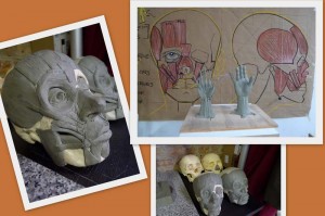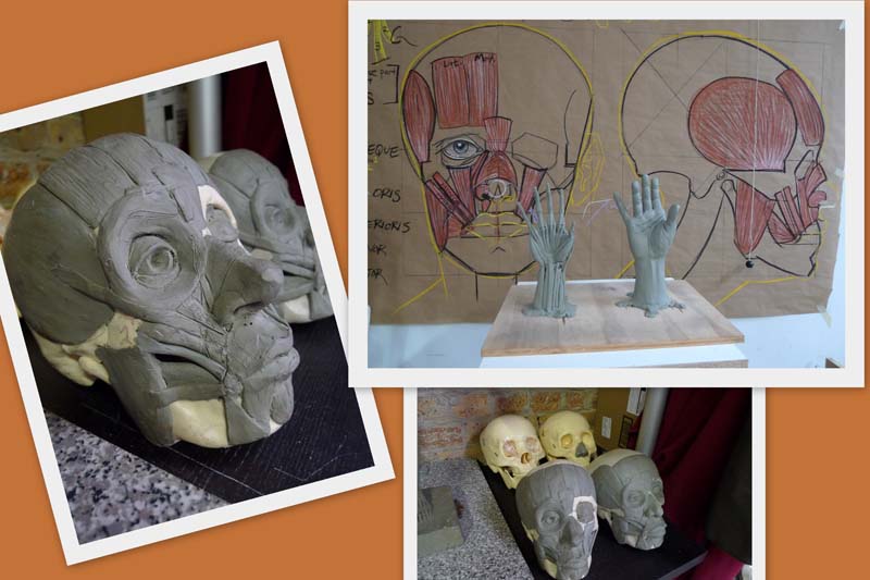 The sculpting classes range from 8 weeks for the skeleton and 8 weeks for the muscles to 4 weeks for laying muscles on a pre-purchased skull. Mindy also teaches a class on hand anatomy.