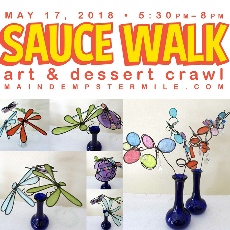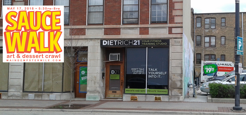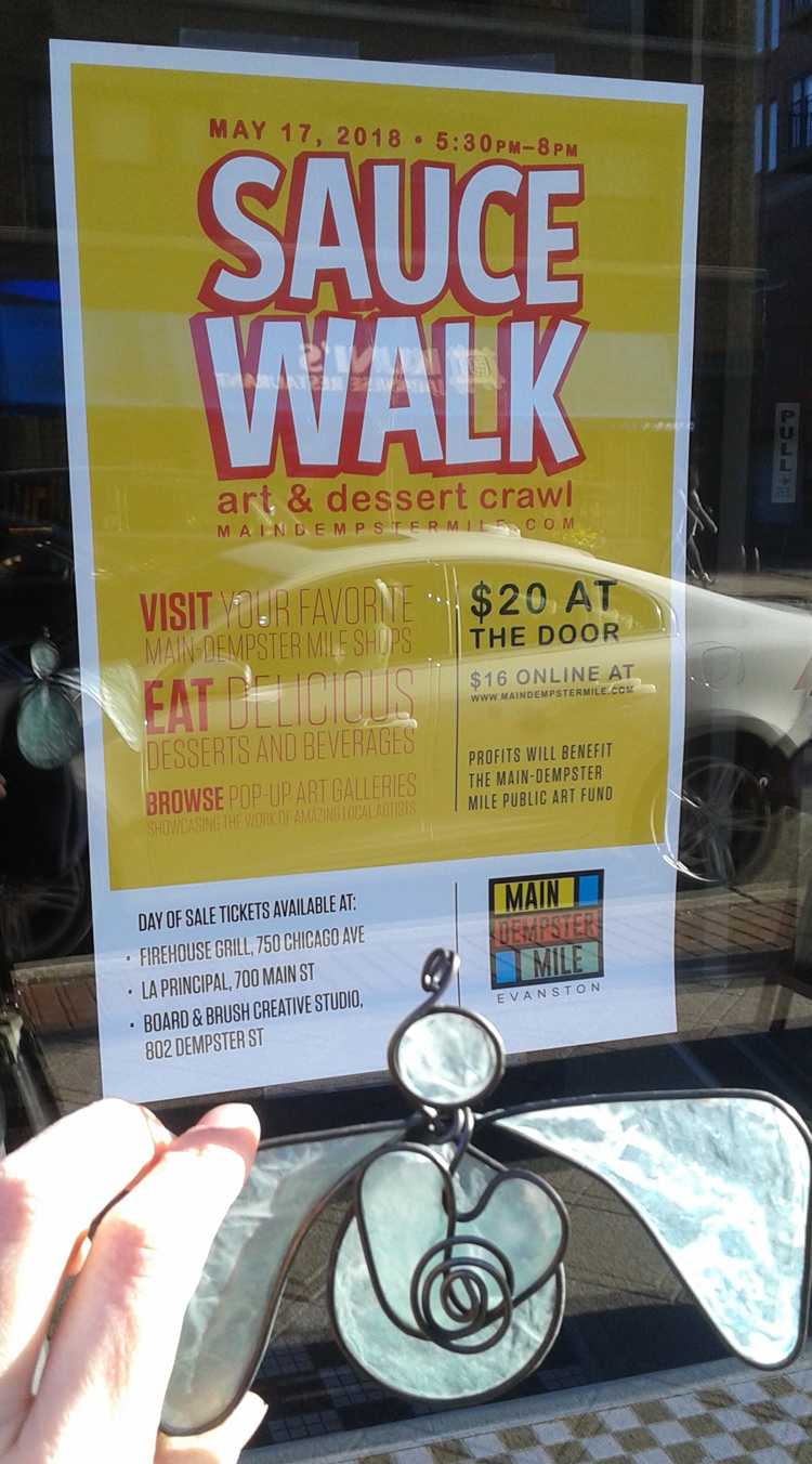 Angel has photobombed the wine walk in September, and we’ve warmed up during the Warm Bevvy Walk in December. This year, the Main-Dempster Mile is adding another walk to its repertoire with the Sauce Walk! On Thursday, May 17 I will be popping up a temporary gallery in Dietrich 21/D21 during Sauce Walk, A Neighborhood Art & Dessert Crawl in Evanston.
