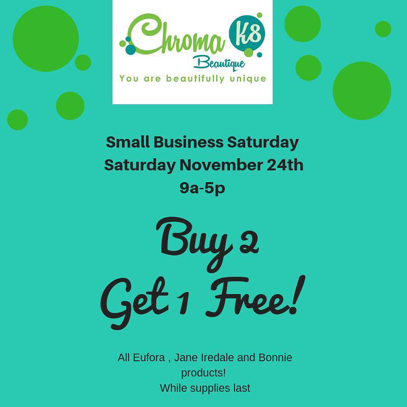 They will offer buy 2, get 1 free on select products in the salon on Saturday from 9 am to 5 pm. If you’re not in town, call 773.654.3961 and they will shop for you. ChromaK8 is located at 5425 N Lincoln Ave in Chicago.