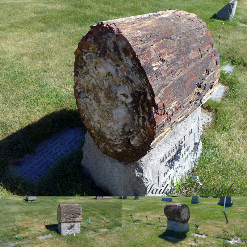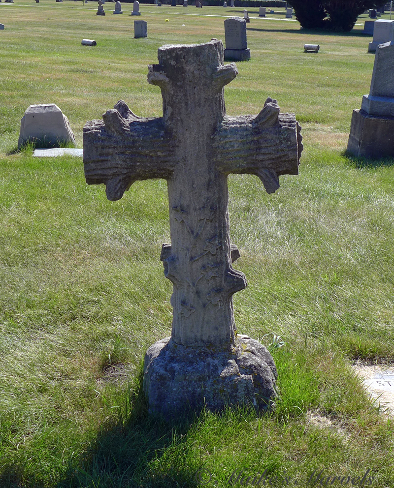 The tree-trunk headstones are apparently an indication of Woodmen of the World membership. “An enduring physical legacy of the organization is distinctive headstones in the shape of a tree stump. This was an early benefit of Woodmen of the World membership, and they are found in cemeteries nationwide. This program was abandoned in the late 1920s as it was too costly. Typically the headstones would include a depiction of the WOW relics and symbols of the organization.”